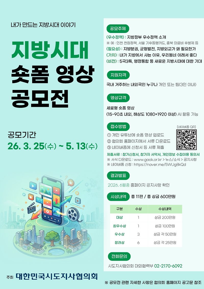대한민국시도지사협의회는 지방분권·균형발전·지방외교 등 지방시대의 핵심 가치를 널리 알리고, 국민적 공감대를 확산하기위해 『지방시대 숏폼 영상 공모전』을 개최합니다. 지방정부의 우수정책, 지방분권의 필요성, 내가 사는 지역의 가치, 새로운 지방시대에 대한 기대 등 다양한 주제를 숏폼 영상에 자유롭게 담아 주세요. 지방시대의 의미를 함께 나누는 이번 공모전에 지역에 대한 애정과 창의력을 가진 분들의 많은 관심과 참여를 바랍니다.